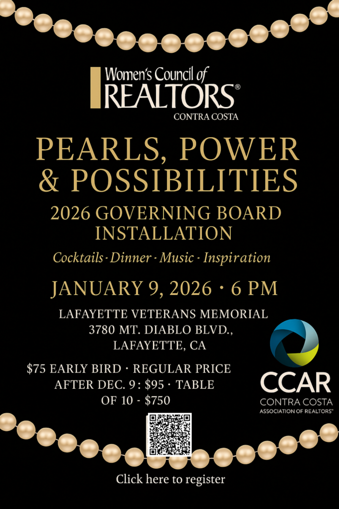 CCAR REALTOR® Members: Join us for an evening of appetizers, drinks, raffles, and fun at Lafayette Library’s Don Tatzin Community Hall on Oct. 22, from 5pm – 7pm! Discover the wide range of services offered by local industry partners while supporting two amazing causes—the CCAR Scholarship Foundation and CCAR Helping Hands.