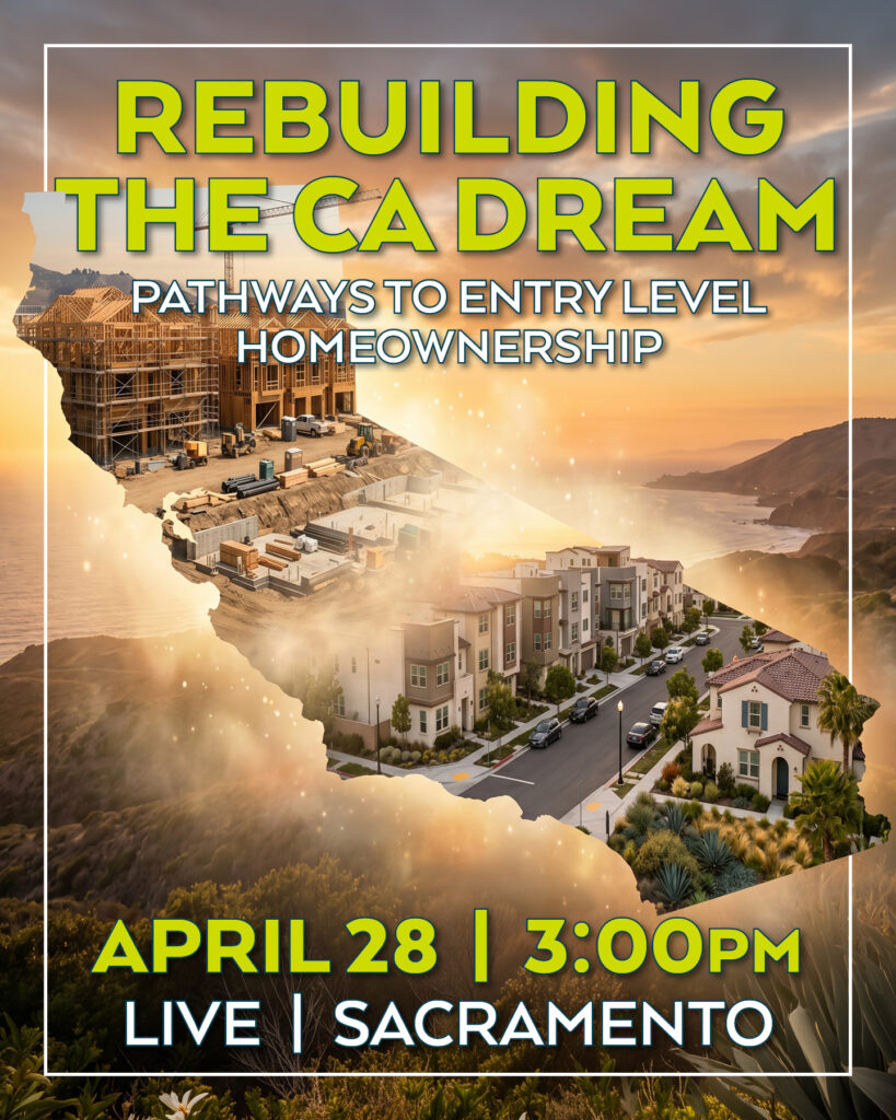Join CCRE on Tue, April 28 from 3:00 – 4:30pm at the SAFE Credit Union Convention Center in Sacramento for Rebuilding the California Dream: Pathways to Entry-Level Homeownership. This timely panel will explore the challenges facing first-time buyers and examine the financial, regulatory, and development factors shaping entry-level homeownership in California, along with practical solutions to expand access to ownership.
